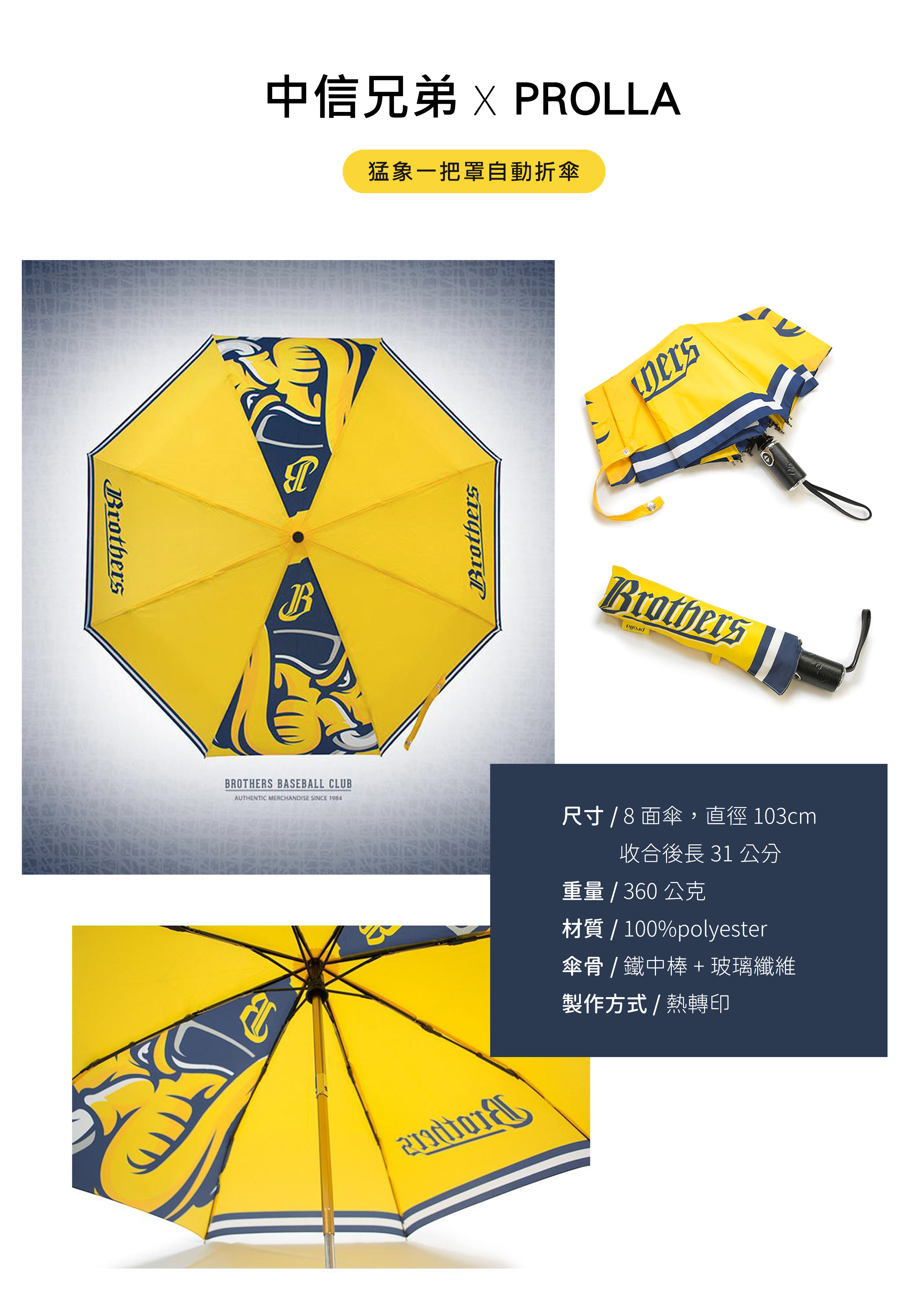 Prolla 承製中信兄弟象自動折傘 — 加強傘架結構,鮮明亮黃的中信兄弟顏色,霸氣的象徵Logo,走在路上、拿在手上,不僅實用又有設計感的週邊商品,對粉絲來說更加珍貴、具有紀念意義。