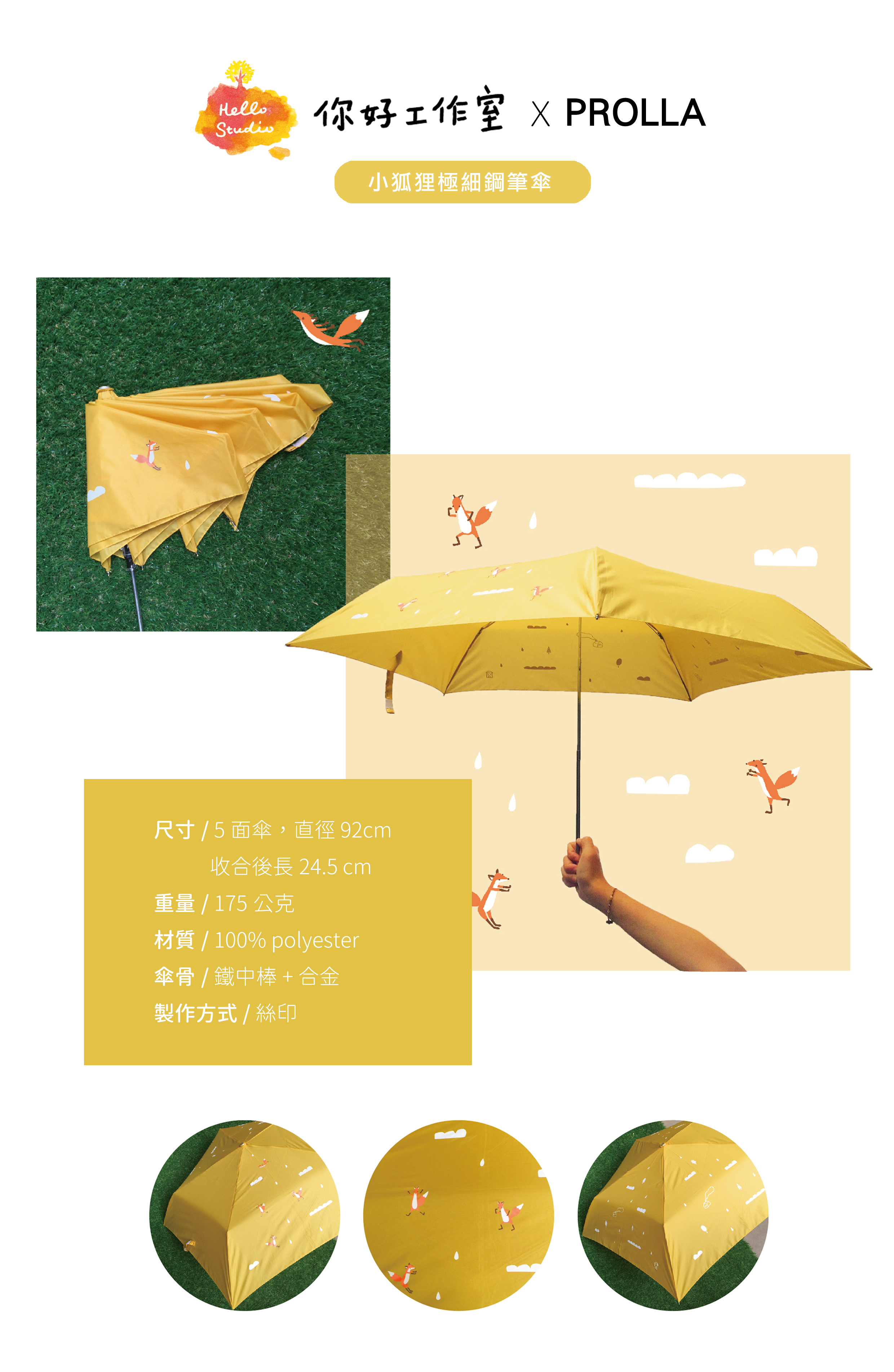 你好工作室與台灣雨傘品牌 — Prolla,共同合作的插畫雨傘。 一樣配上設計師壘摳筆下的小狐狸,蹦蹦跳跳的在傘面上玩耍, 不論晴天、雨天都適合,既不佔包包裡的空間,又讓你撐傘時擁有好心情!