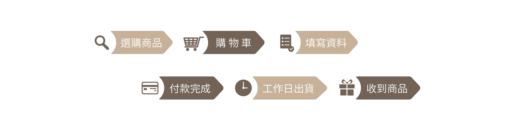 ✦ 選購商品 > 購物車 > 填寫資料 > 付款完成 > 送出訂單 > 等待收貨