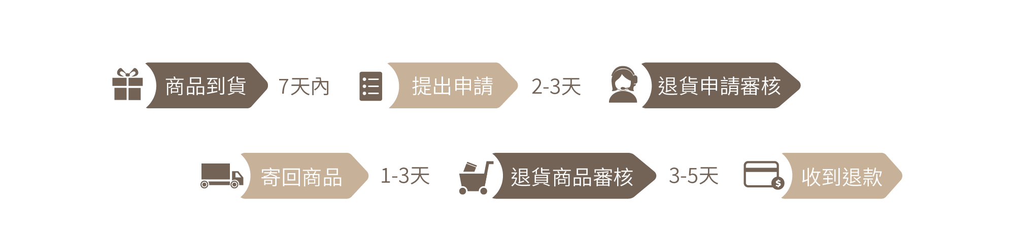 ✦ 商品到貨 > 7天內提出申請 > 退換貨審核 (2-3天) > 寄回商品 (1-3天) > 退貨商品審核 (3-5天) > 收到退款